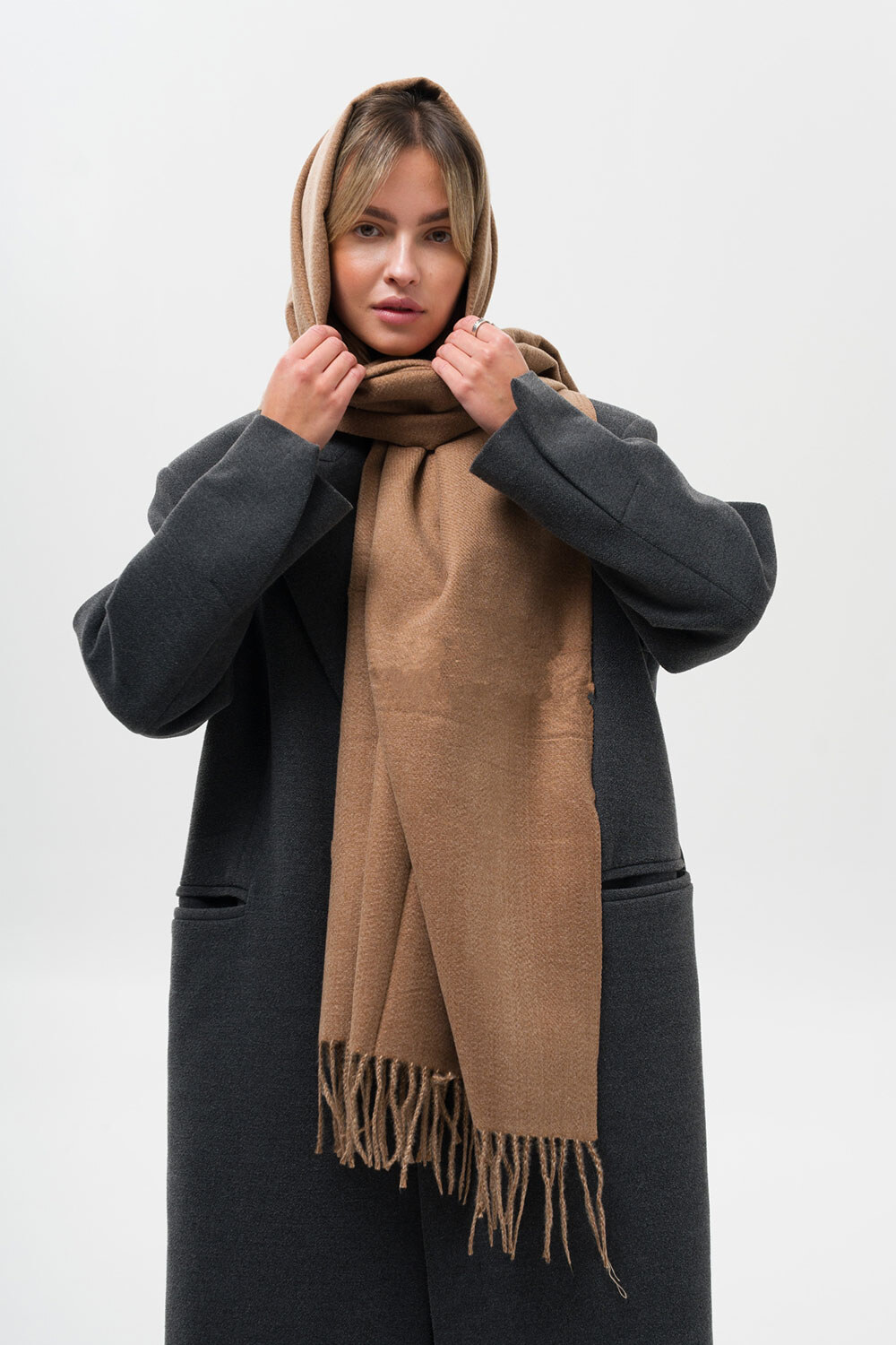 • Шарф з бахромою по краях чудово зігріває та підходить як для повсякденного носіння, так і для більш формальних подій.