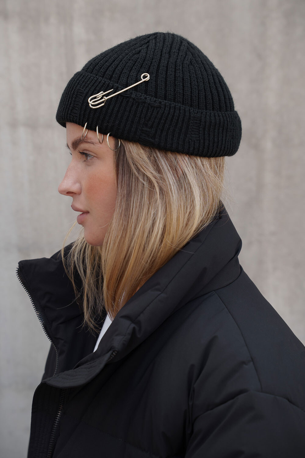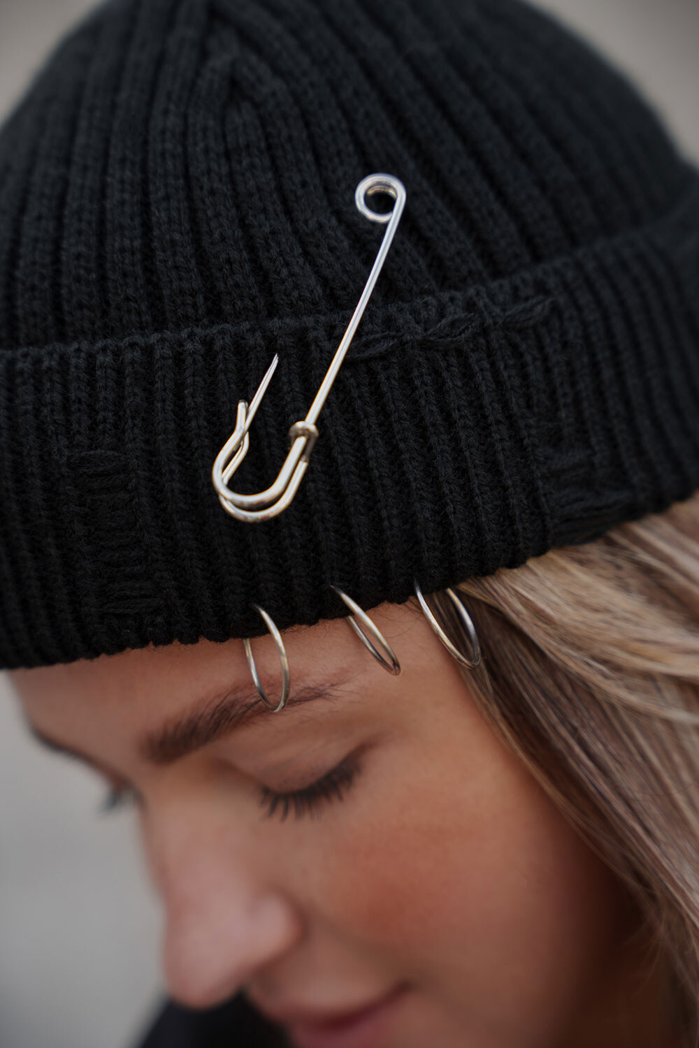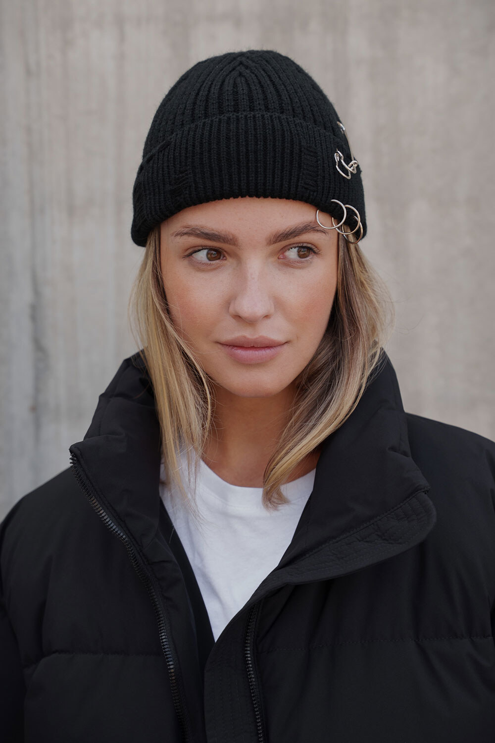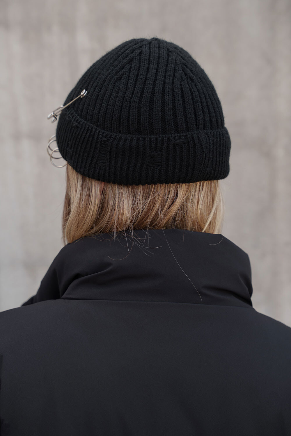 • Шапка виконана з дизайнерськими пошкодженнями та додатковими знімними елементами у вигляді кілець та шпильки.