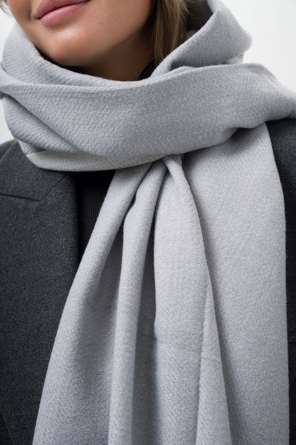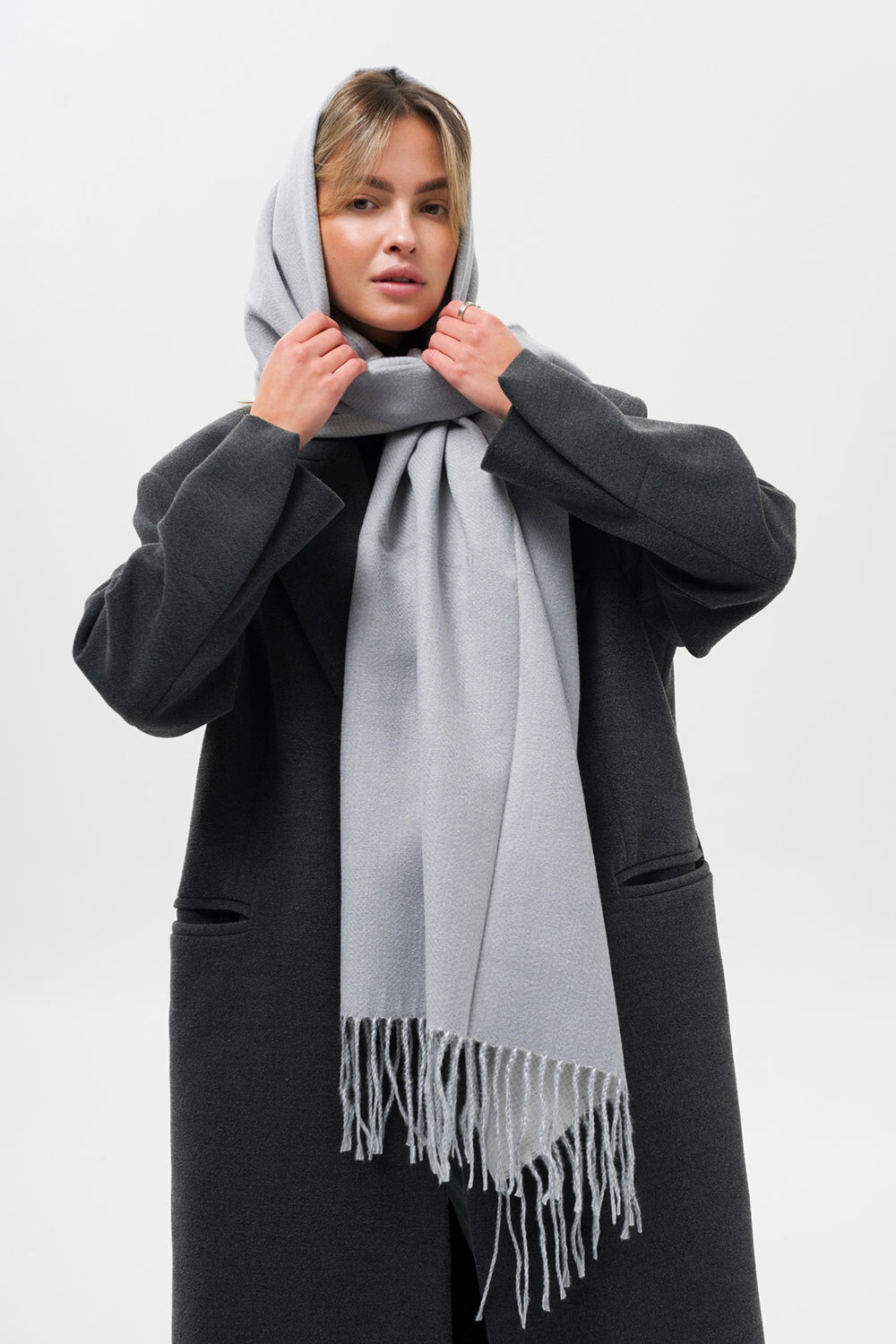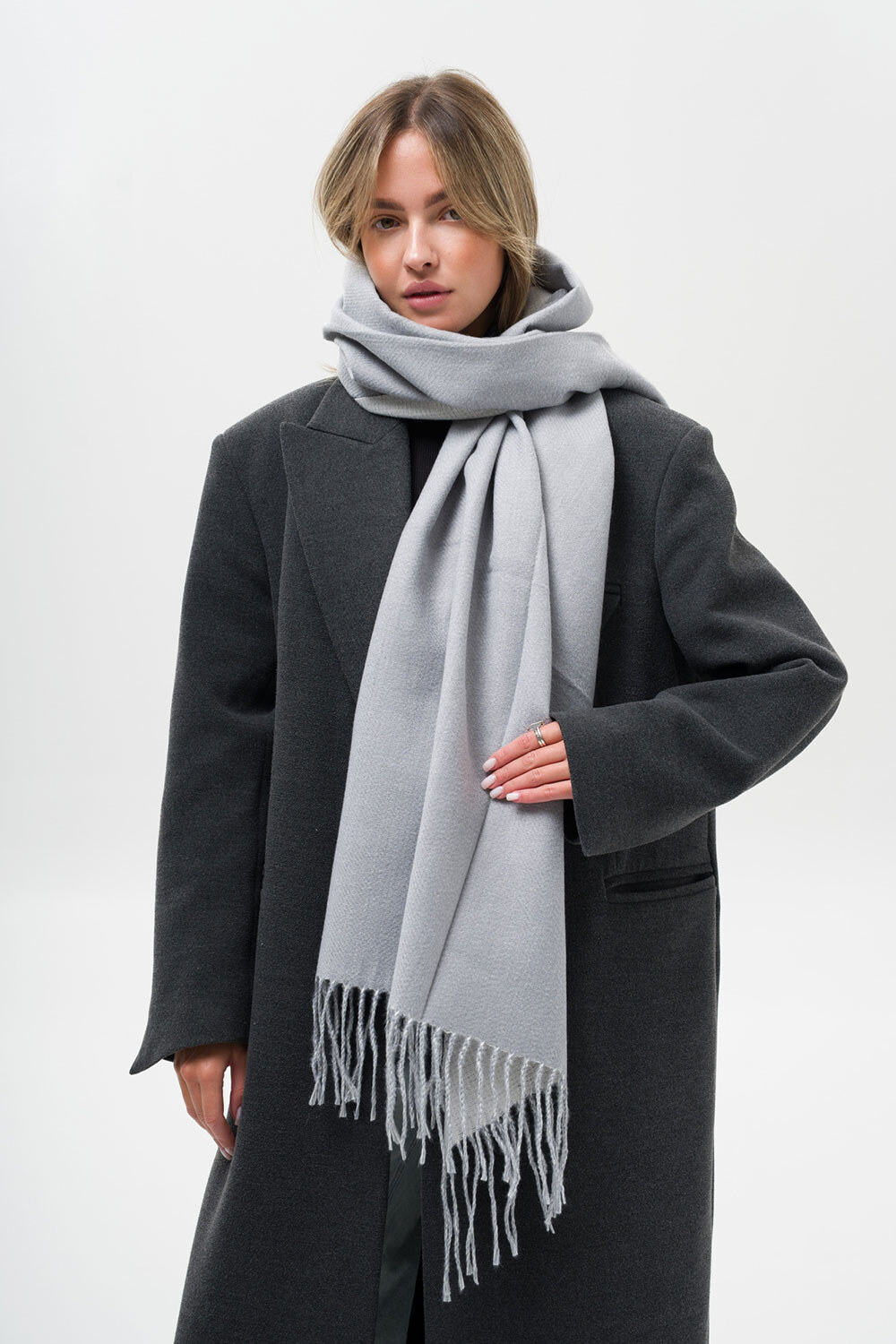 • Шарф з бахромою по краях чудово зігріває та підходить як для повсякденного носіння, так і для більш формальних подій.