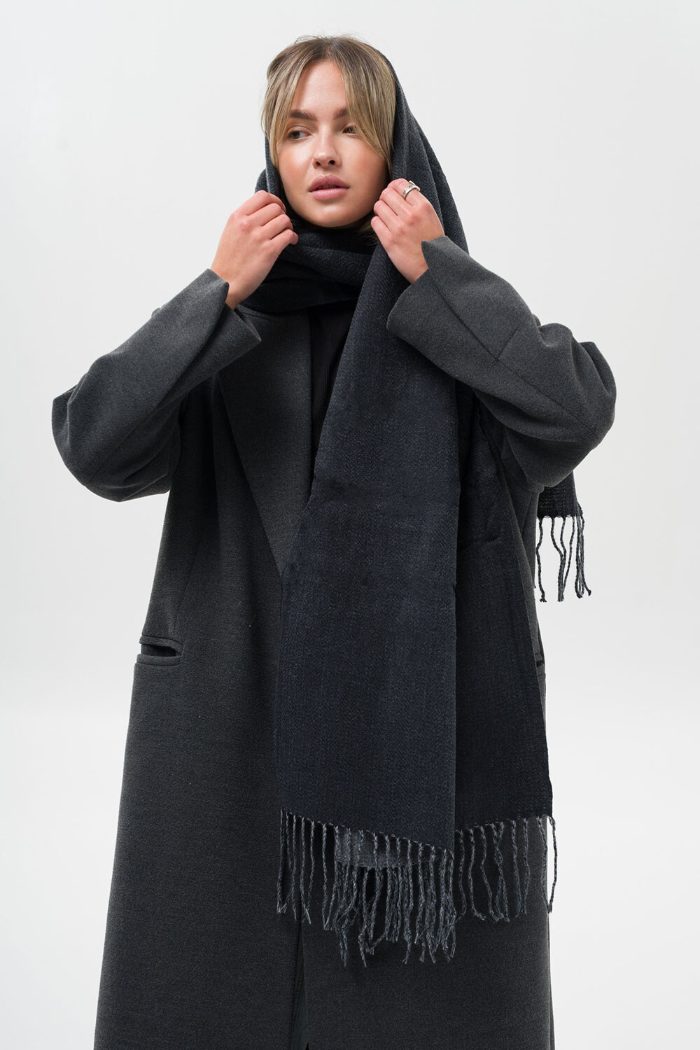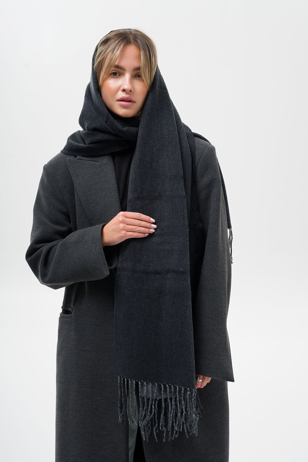 • Шарф з бахромою по краях чудово зігріває та підходить як для повсякденного носіння, так і для більш формальних подій.