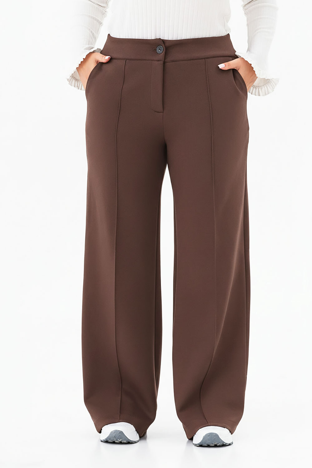 Замовляла білі. Розмір Л. Стегна 108. Талія 88. Сіли ідеально. На зріст 168 довжина без підбору. Тканина дуже цікава. Зовні трикотаж, всередині гладенька ніби шовк. Прекрасно прасуються. Важка тканина гарно обтяжує брюки від стегна до підлоги. Еластичні але тримають форму. Прострочена стрілка тільки спереду, придає стрункості силуету. Мені виріб дуже сподобався! Так хочеться придбати такі ж в темнішому кольорі, але нажаль, закінчилися в моєму розмірі. Зрадію, якщо відшиєте нову партію в коричневому або чорному кольорі на похмуру вогку осінь.