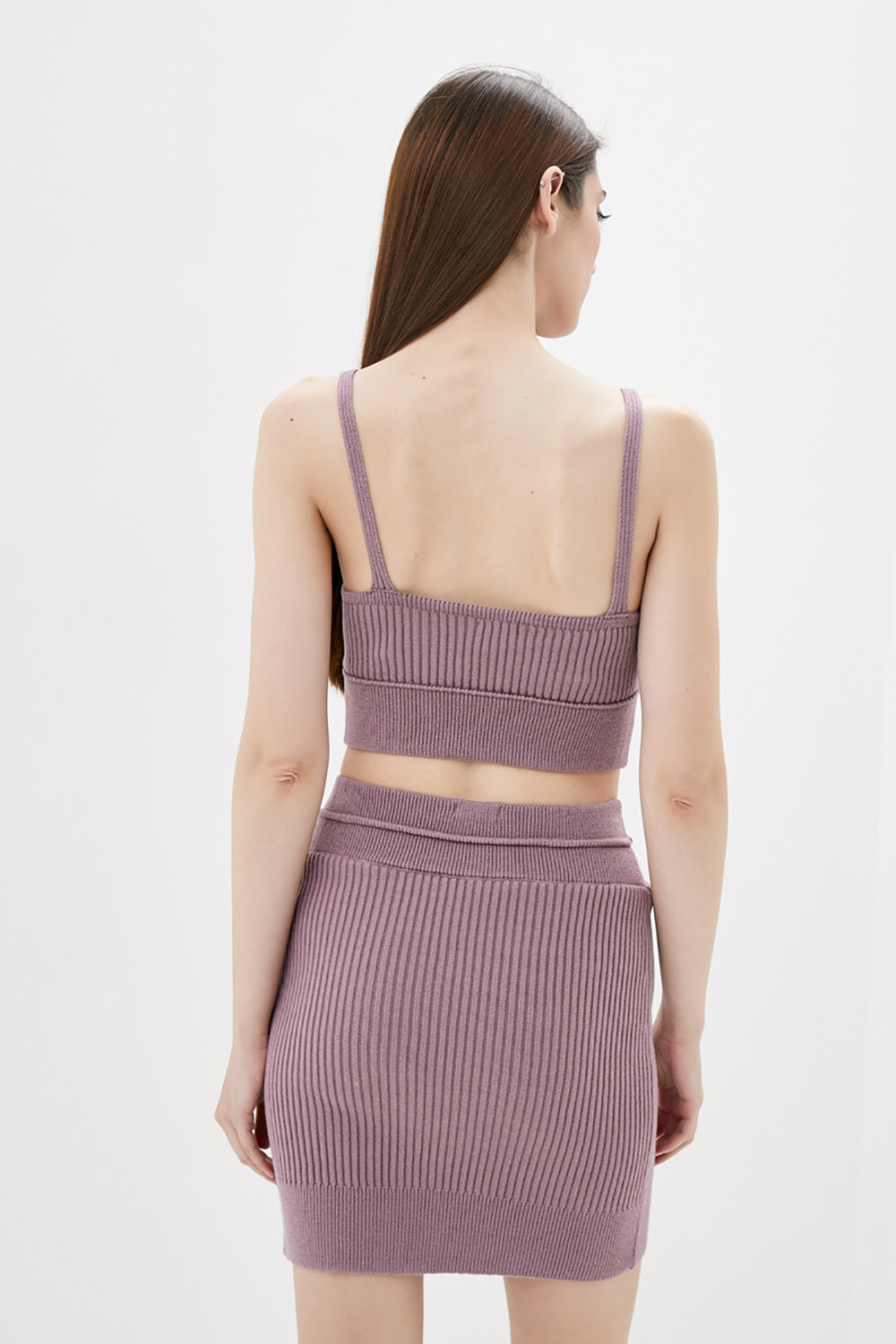 • Женский вязаный костюм состоит из топа и юбки в рубчик.