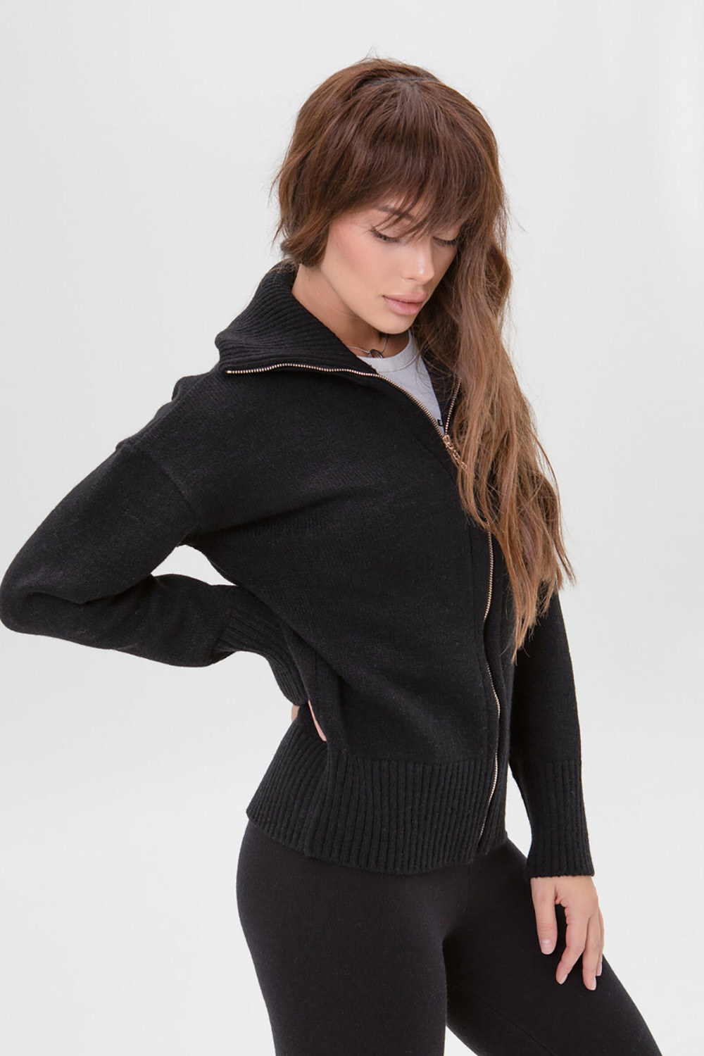 • Высокий воротник на молнии защищает от ветра, а удлиненные манжеты на рукавах и по низу изделия визуально подчеркивают стройность силуэта.